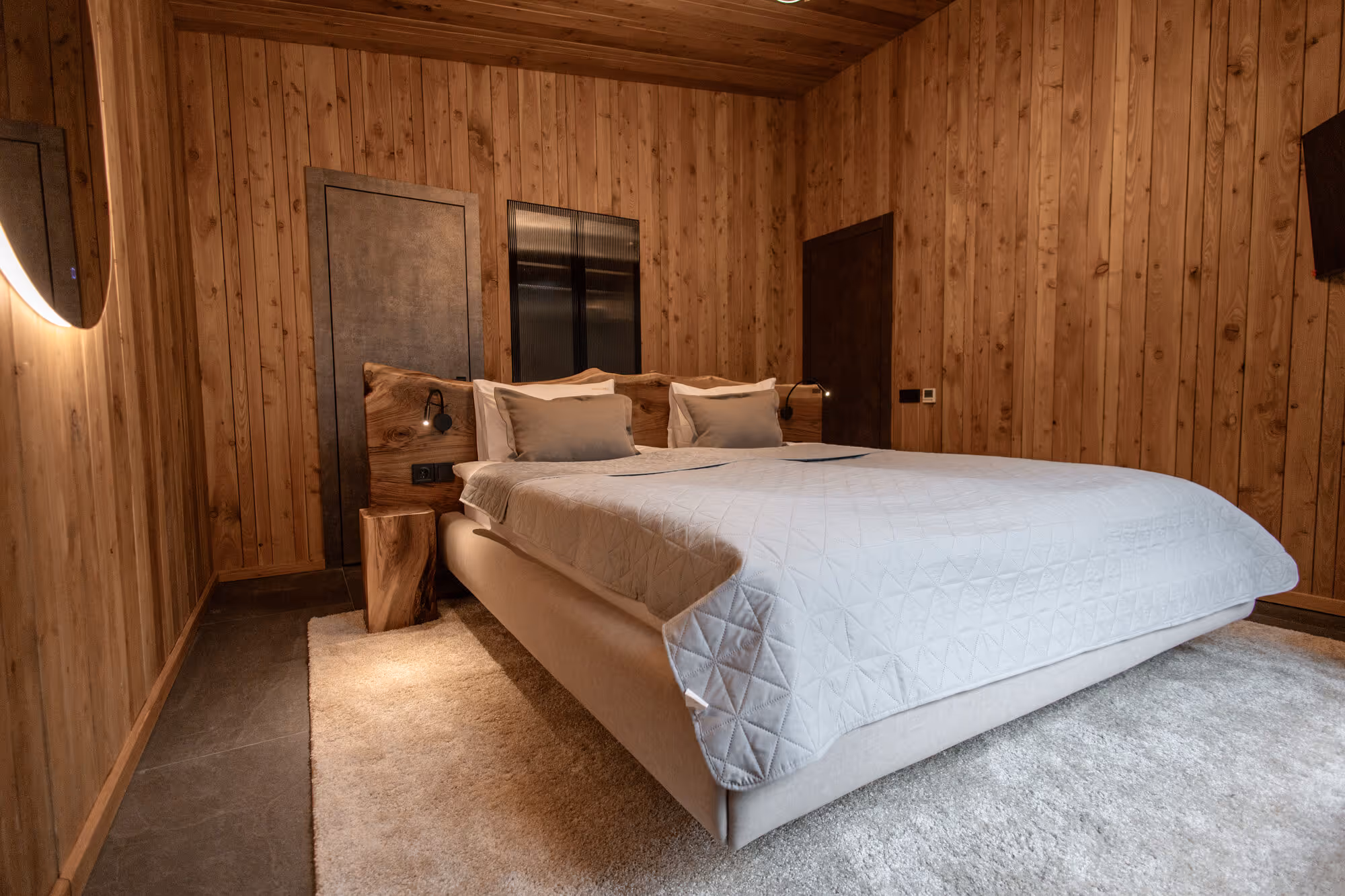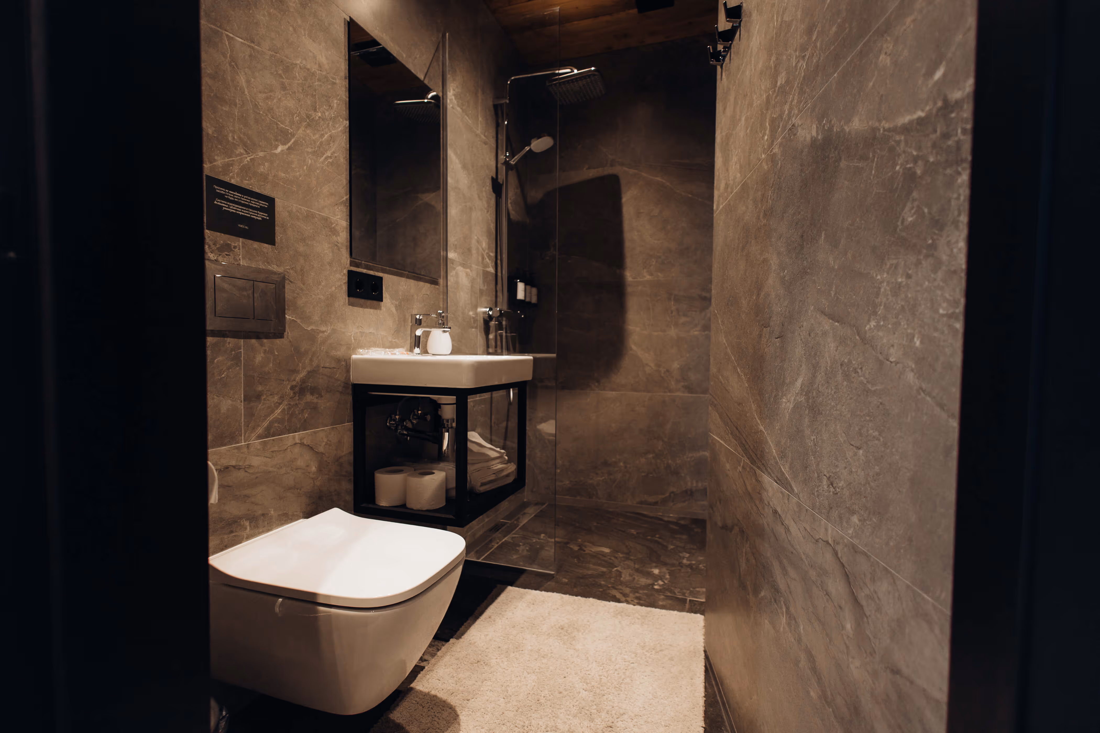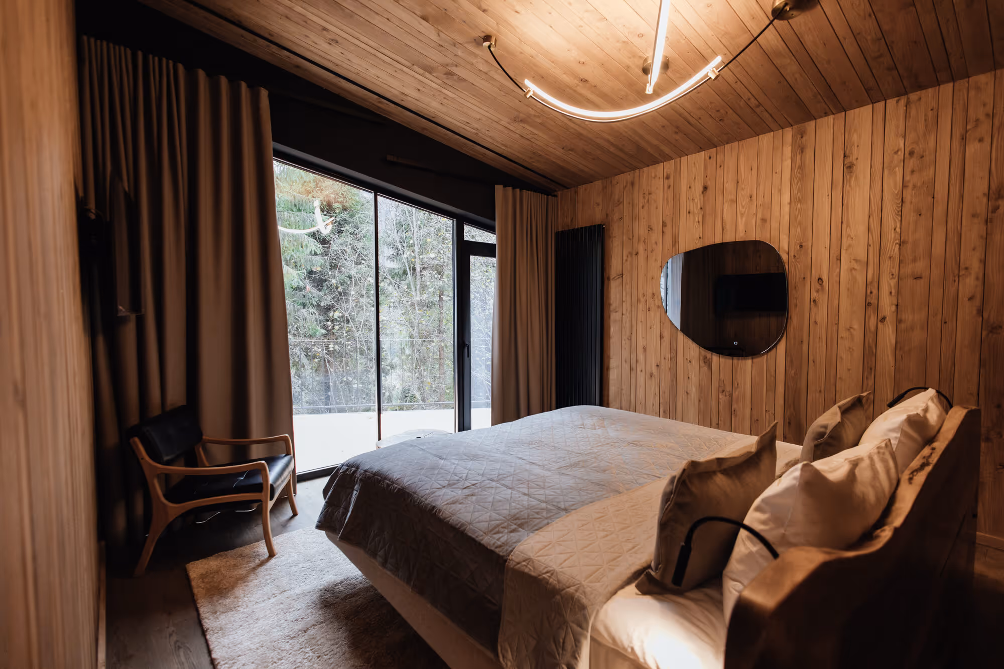 Створений для тих, хто цінує спокій, приватність і натуральні матеріали. Планування передбачає: простору кухню-вітальню з панорамними вікнами, каміном на дровах, м’яким розкладним диваном та великим обіднім столом на 6 персон; спальню з великим двоспальним ліжком, продуманим освітленням і затишним інтер’єром; два окремі виходи на терасу — із спальні та кухні-вітальні; терасу облаштовану грилем, обідньою зоною та м’яким диваном для відпочинку серед лісу; два санвузли: головний — із просторою ванною та гостьовий — із душовою; коридор, гардеробна та технічне приміщення забезпечують комфорт і зручність щоденного перебування.