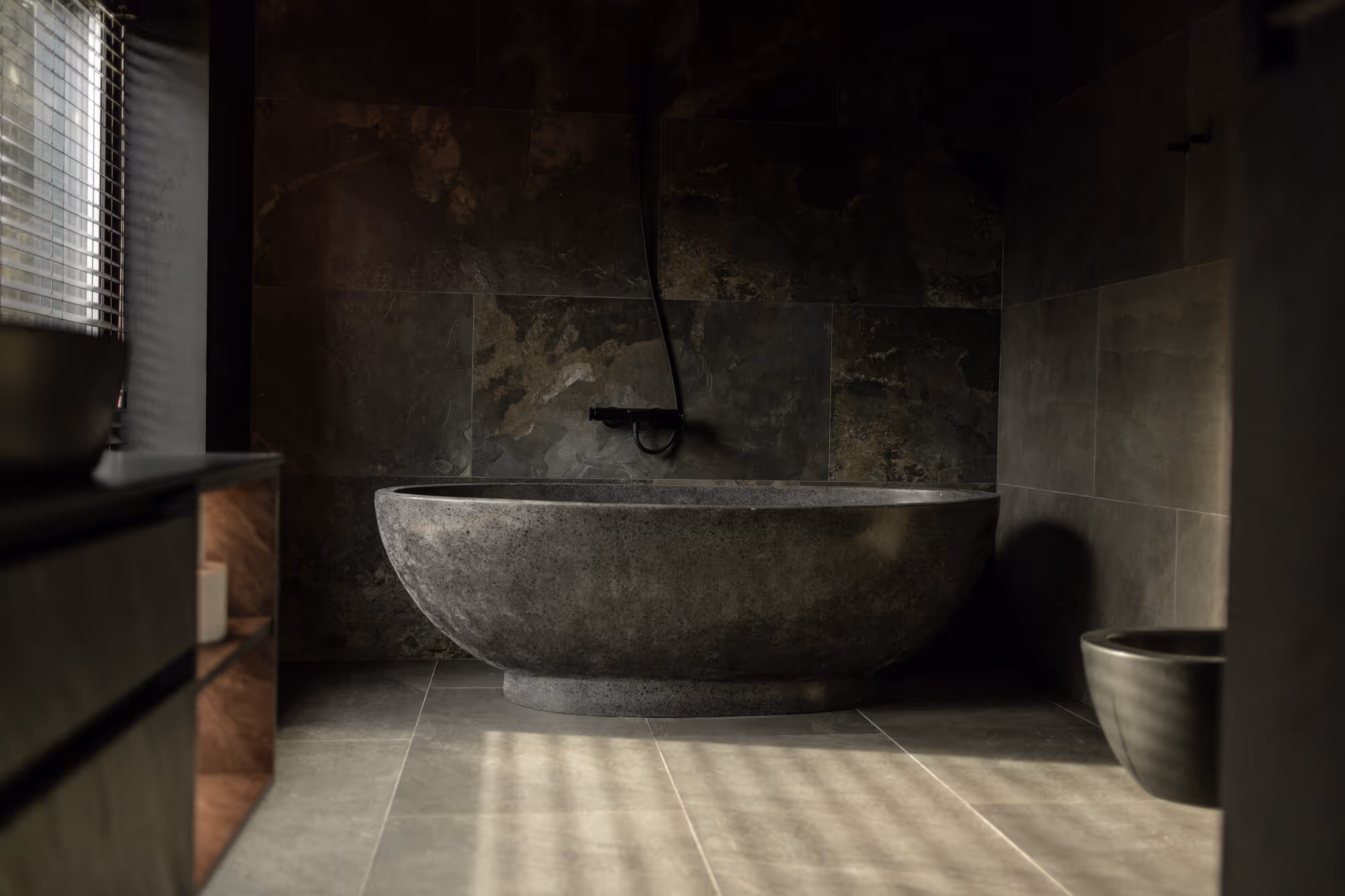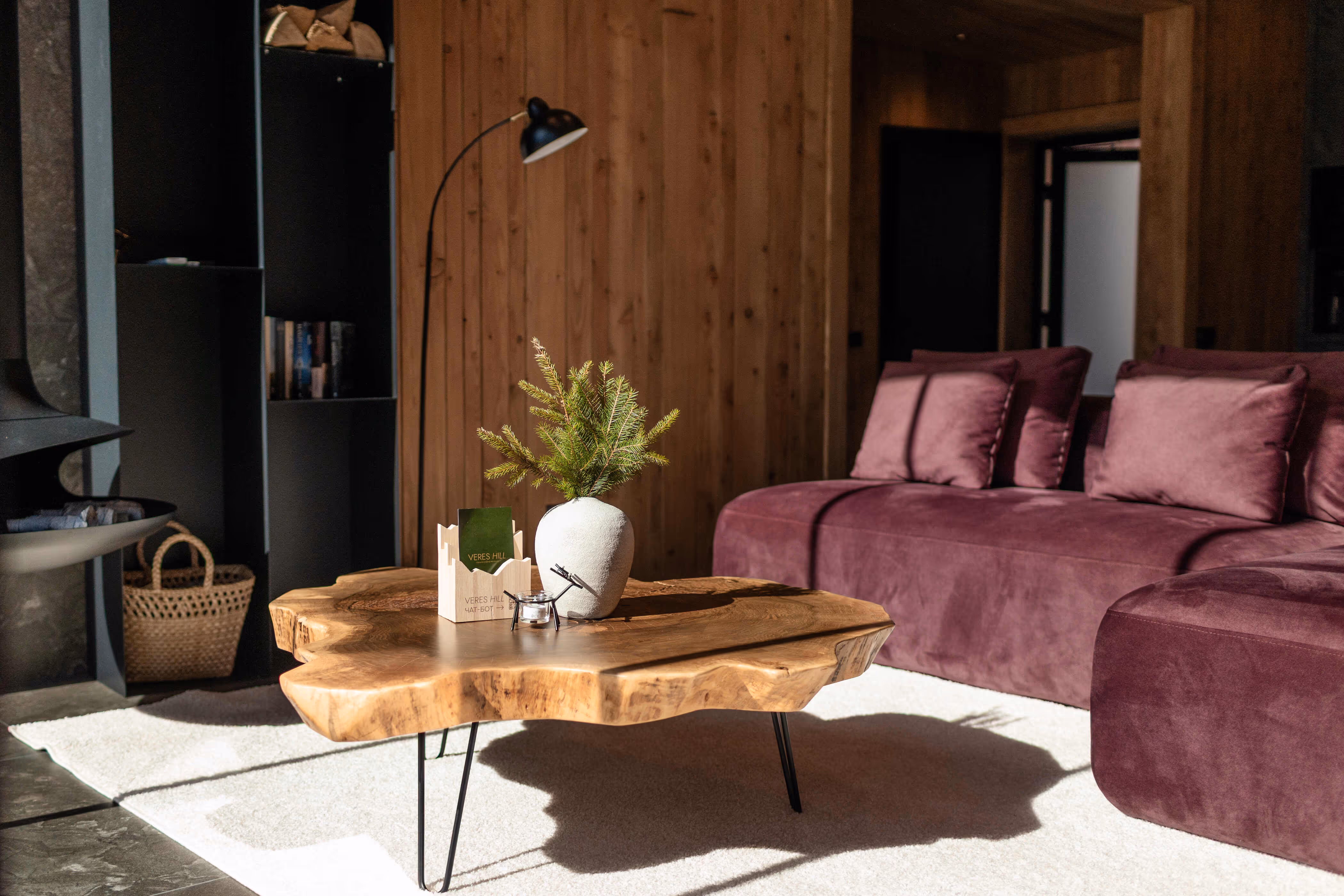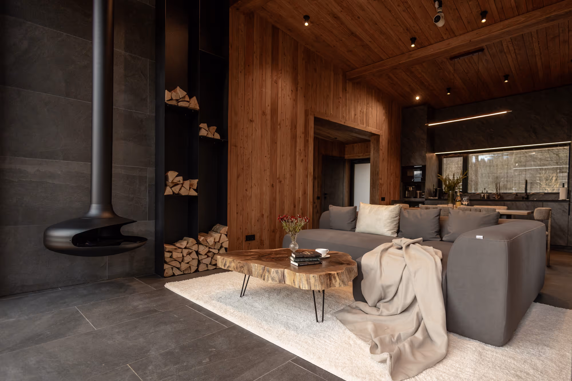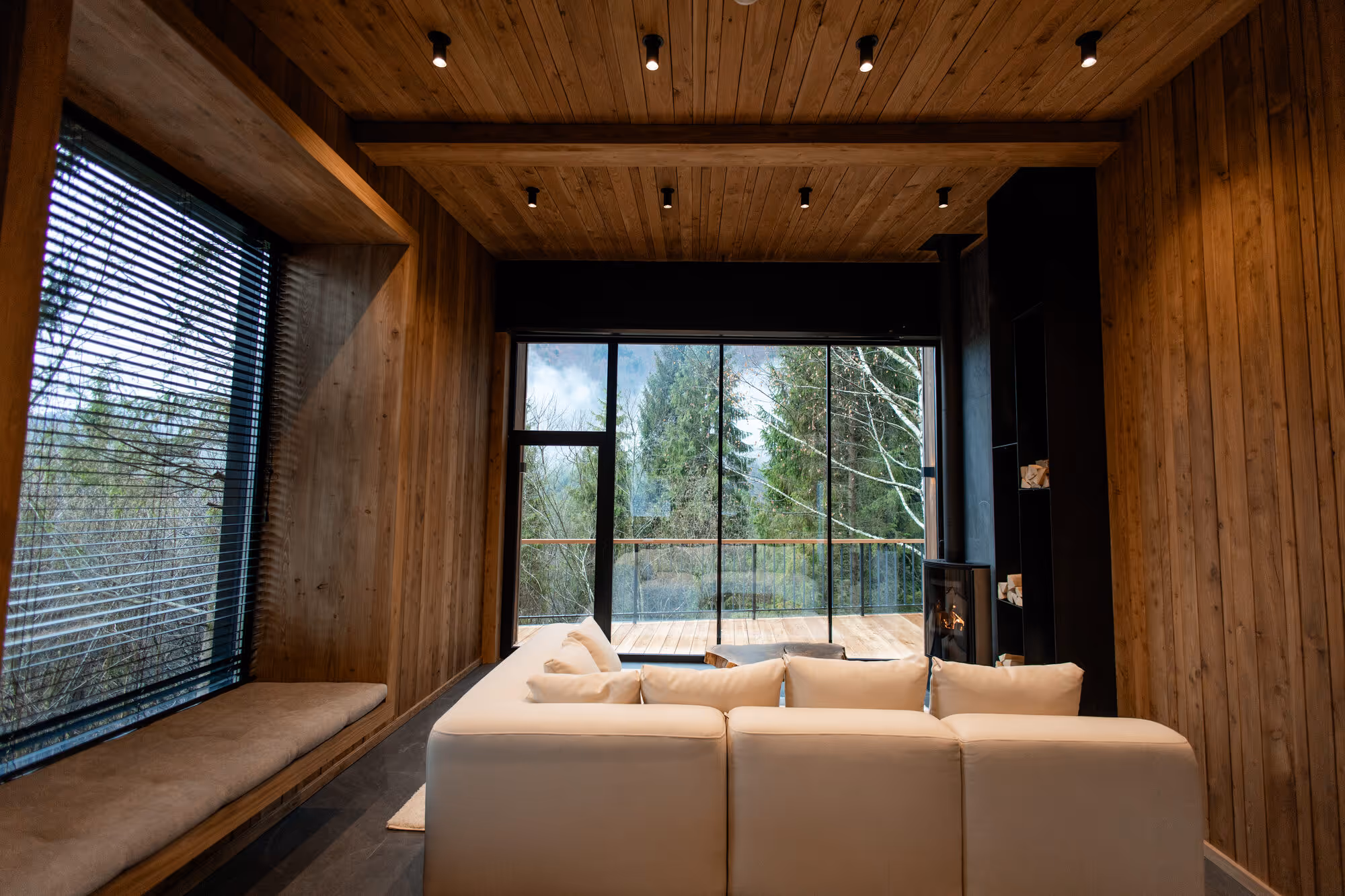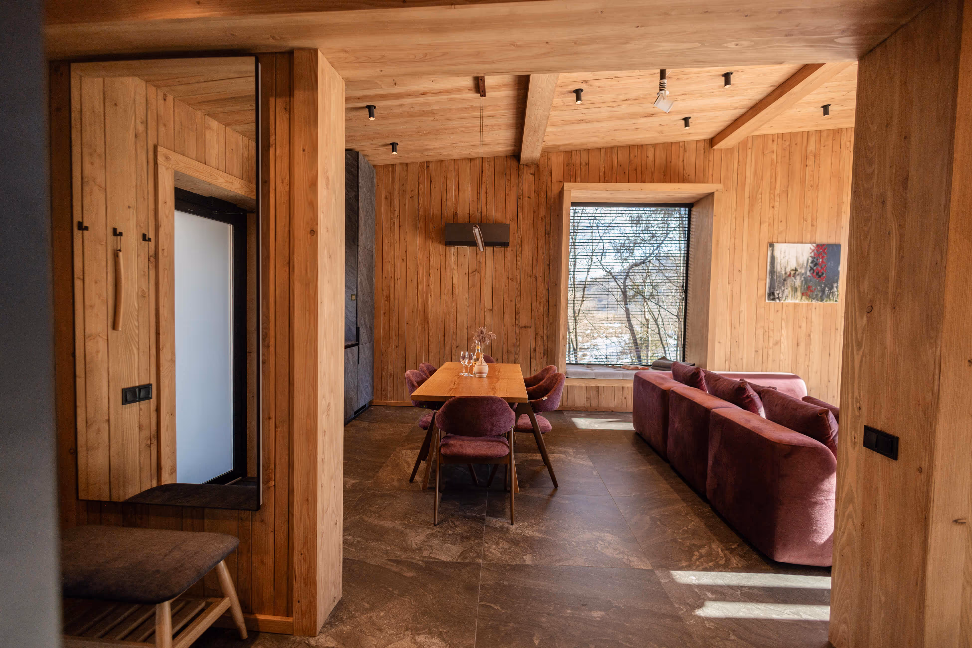 У котеджі використано натуральне дерево, камінь і теплі природні фактури. Біля будинку облаштована затишна приватна відпочинкова зона.