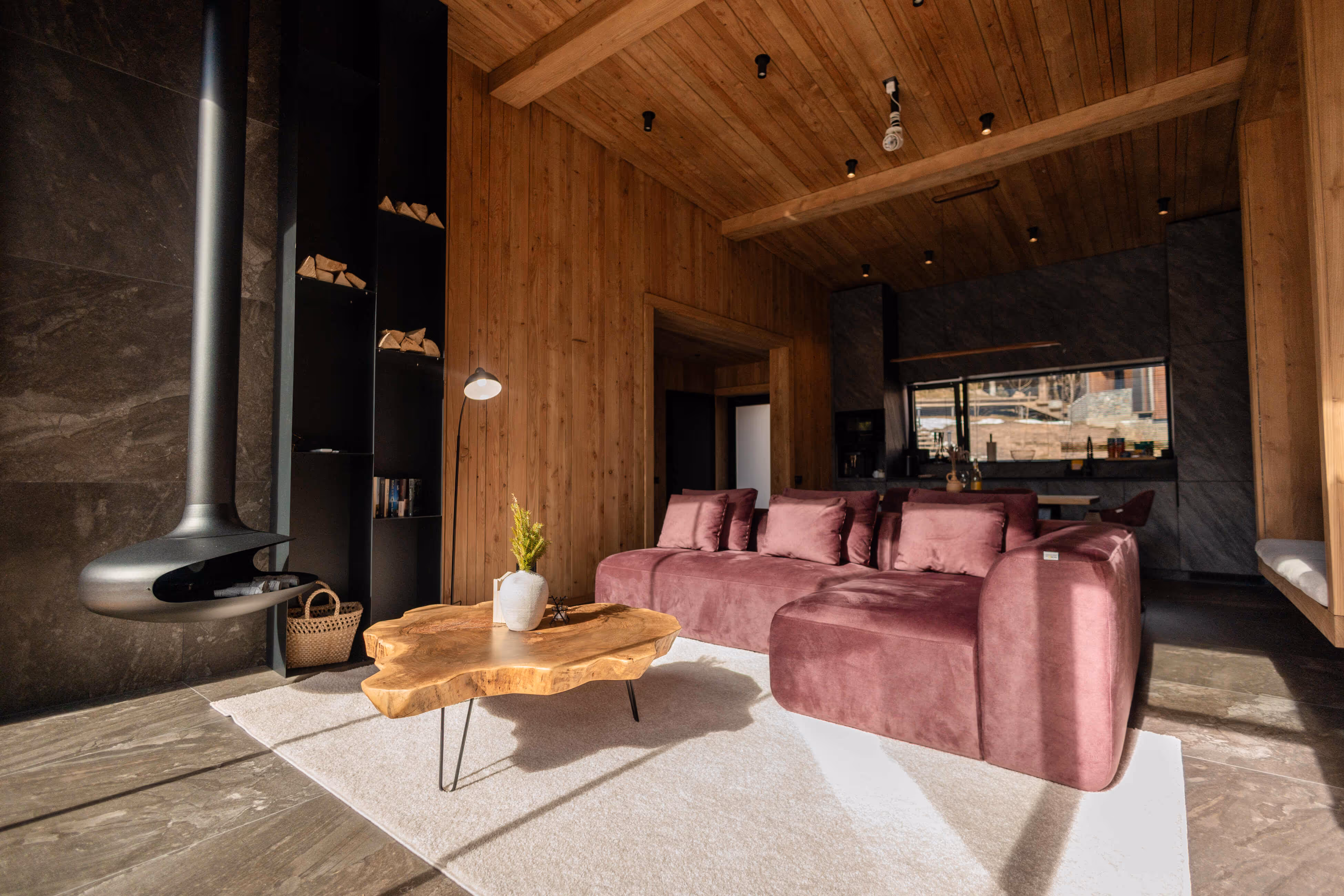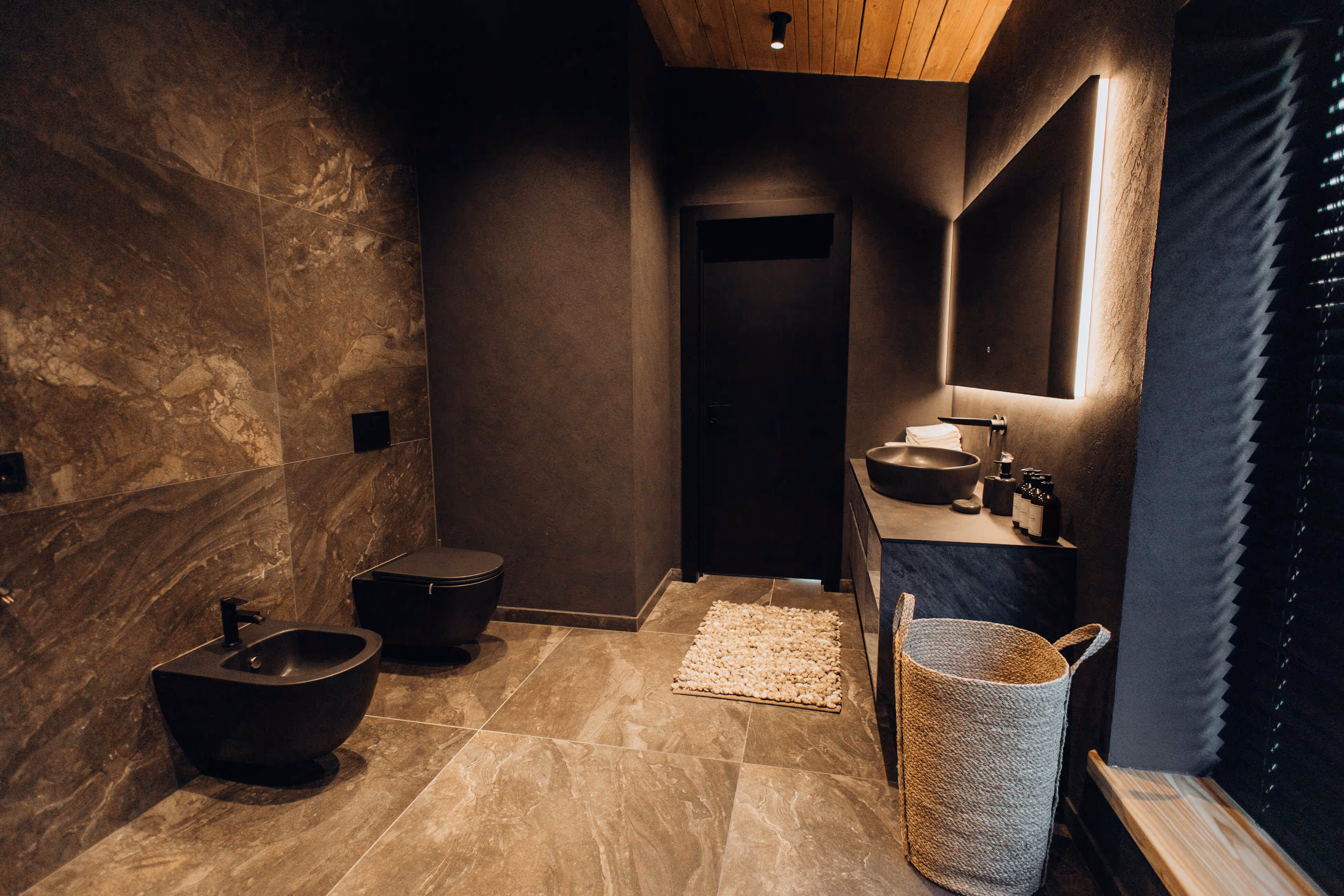 У будинку розташовані 2 спальні, кожна з санвузлом. Одна спальня має вихід на терасу із зоною BBQ, інша — на балкон, з якого відкривається панорама на гори. У кухні-вітальні облаштовано простору кухонну зону з сучасною технікою та стильним оформленням, а також затишну відпочинкову частину з каміном, м’якими меблями та продуманим декором. У котеджі є все необхідне для приємного перебування.