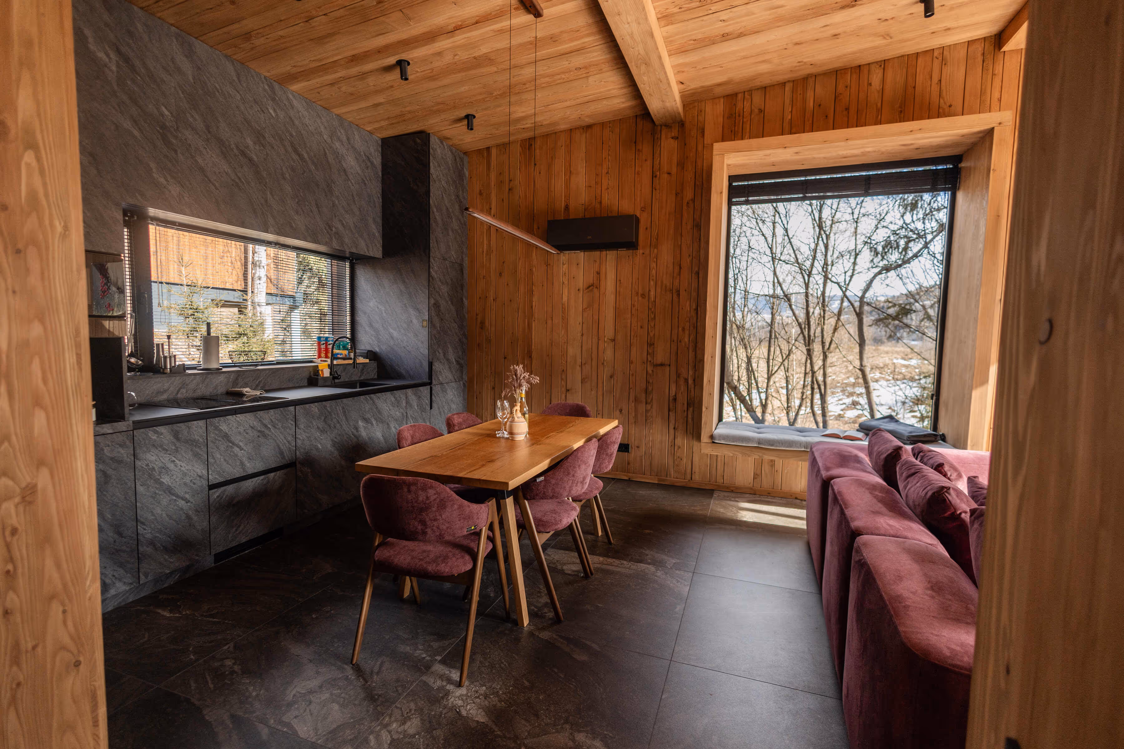 Котедж має великі панорамні вікна і терасу з видом на ліс. Є 2 окремі спальні, простора кухня-вітальня з усім необхідним приладдям, 2 санвузли, велика гардеробна. Крім того, у будинку є камін, тераса для відпочинку зі зоною BBQ, а також чан на дровах.