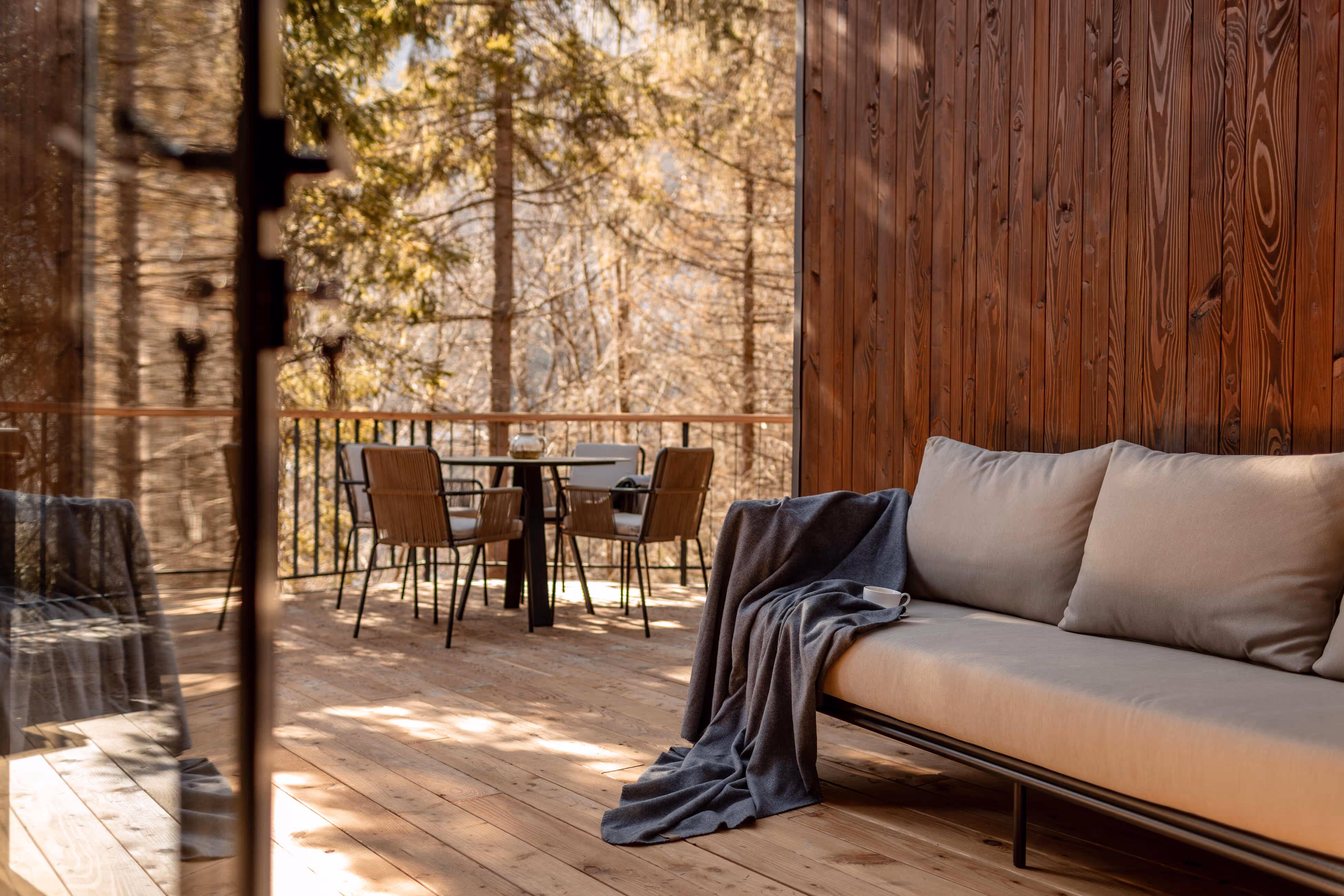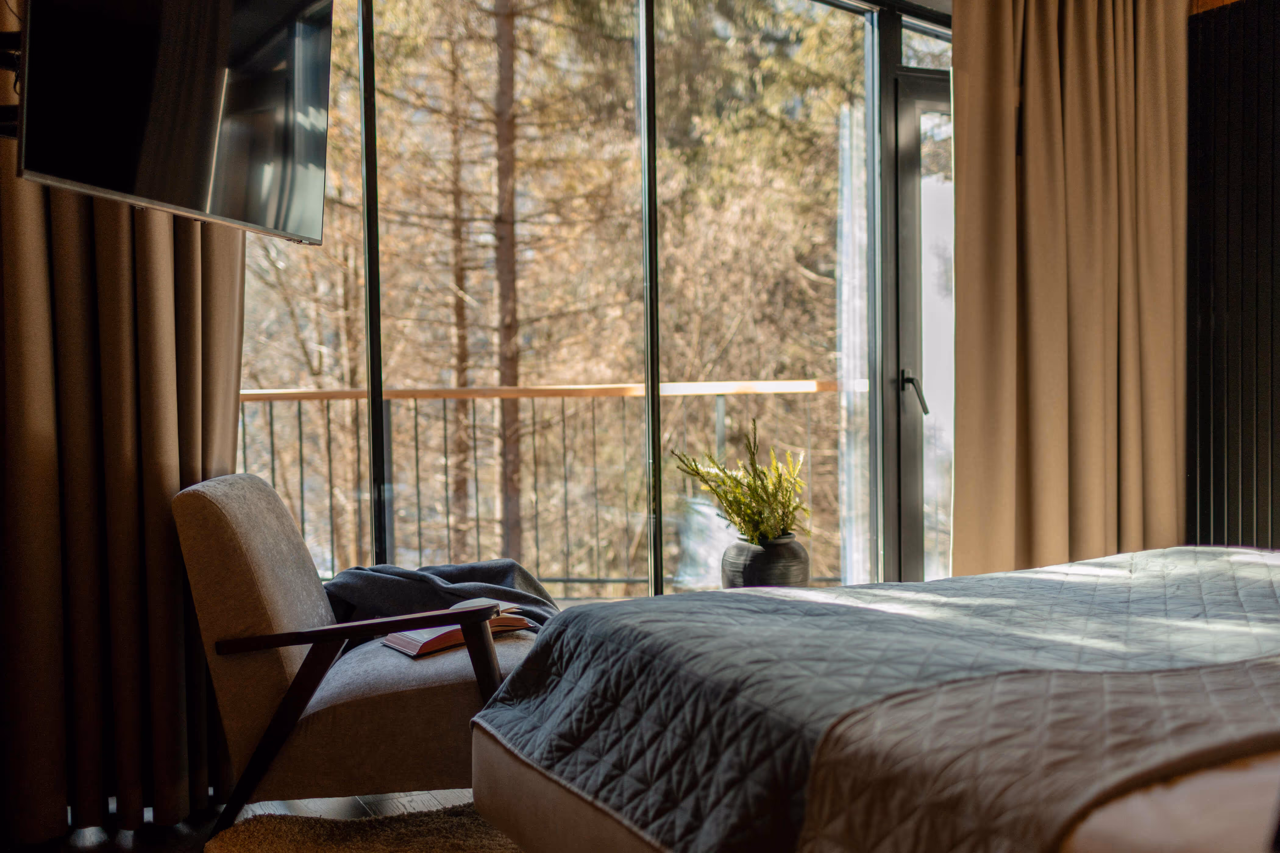 Створений для тих, хто цінує спокій, приватність і натуральні матеріали. Планування передбачає: простору кухню-вітальню з панорамними вікнами, біо каміном, м’яким розкладним диваном та великим обіднім столом на 6 персон; спальню з великим двоспальним ліжком, продуманим освітленням і затишним інтер’єром; два окремі виходи на терасу — із спальні та кухні-вітальні; терасу облаштовану грилем, обідньою зоною та м’яким диваном для відпочинку серед лісу; два санвузли: головний — із просторою ванною та гостьовий — із душовою; коридор, гардеробна та технічне приміщення забезпечують комфорт і зручність щоденного перебування.